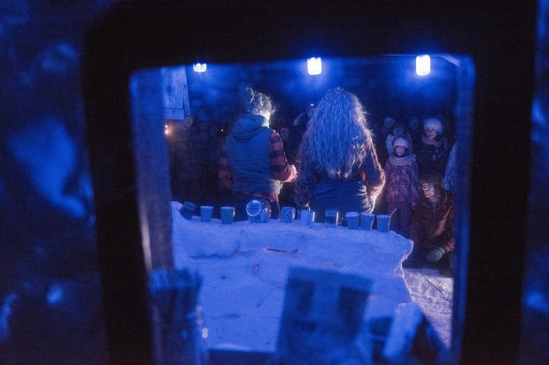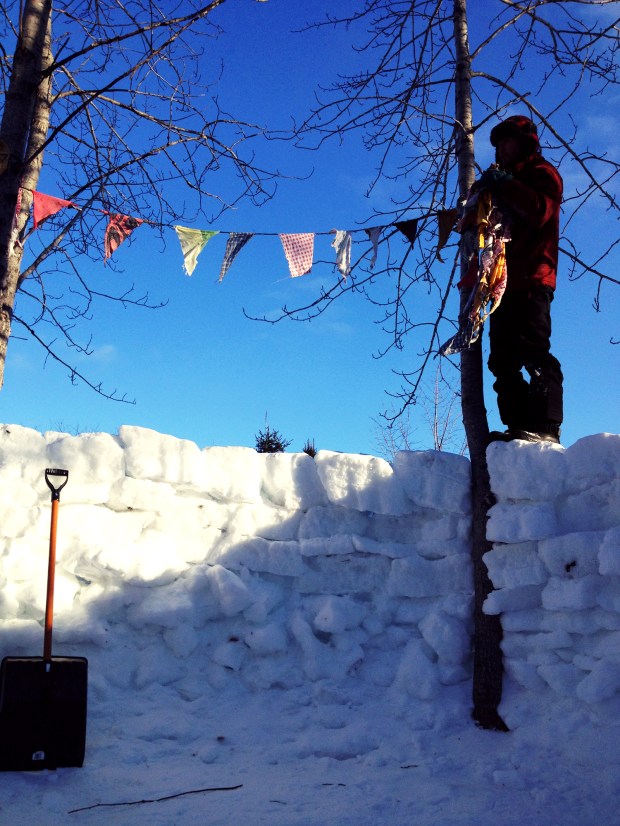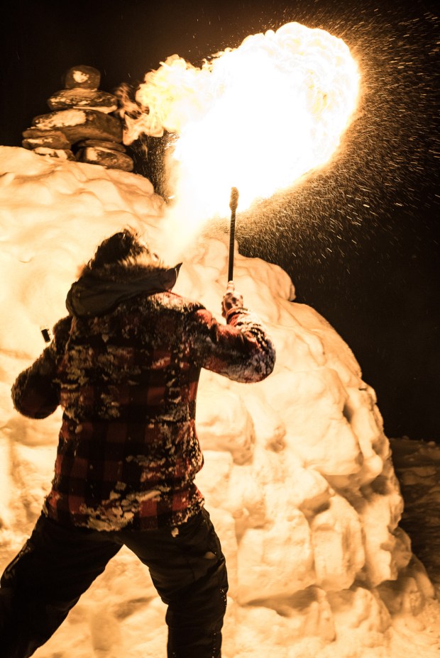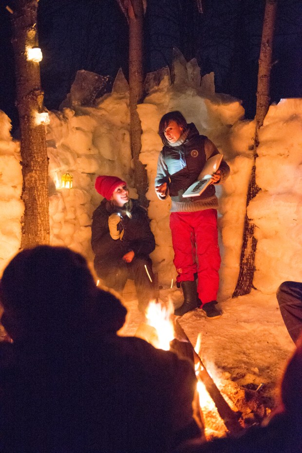 Le projet À Frette, c’était aussi l’aménagement, au cœur de La Martre, d’un fort extérieur pour l’hiver, une salle à ciel ouvert, une scène de neige, de glace et de sapinages. Ça se voulait un lieu rassembleur, imaginé par et pour les citoyens, bâti en collaboration avec les jeunes du voisinage, comme un terrain de jeu ouvert 24 heures. Construit à bout de bras, à coup de pelles, pis à la sueur de nos fronts, le fort servait aussi d’espace de création, de tribune pour les bouches affranchies, de plate-forme pour les corps dégourdis, de carrefour privilégié pour la rencontre entre créateurs et spectateurs. À Frette, c’était une initiative qui voulait allier savoir-faire et faire-savoir dans un esprit de création interactive.