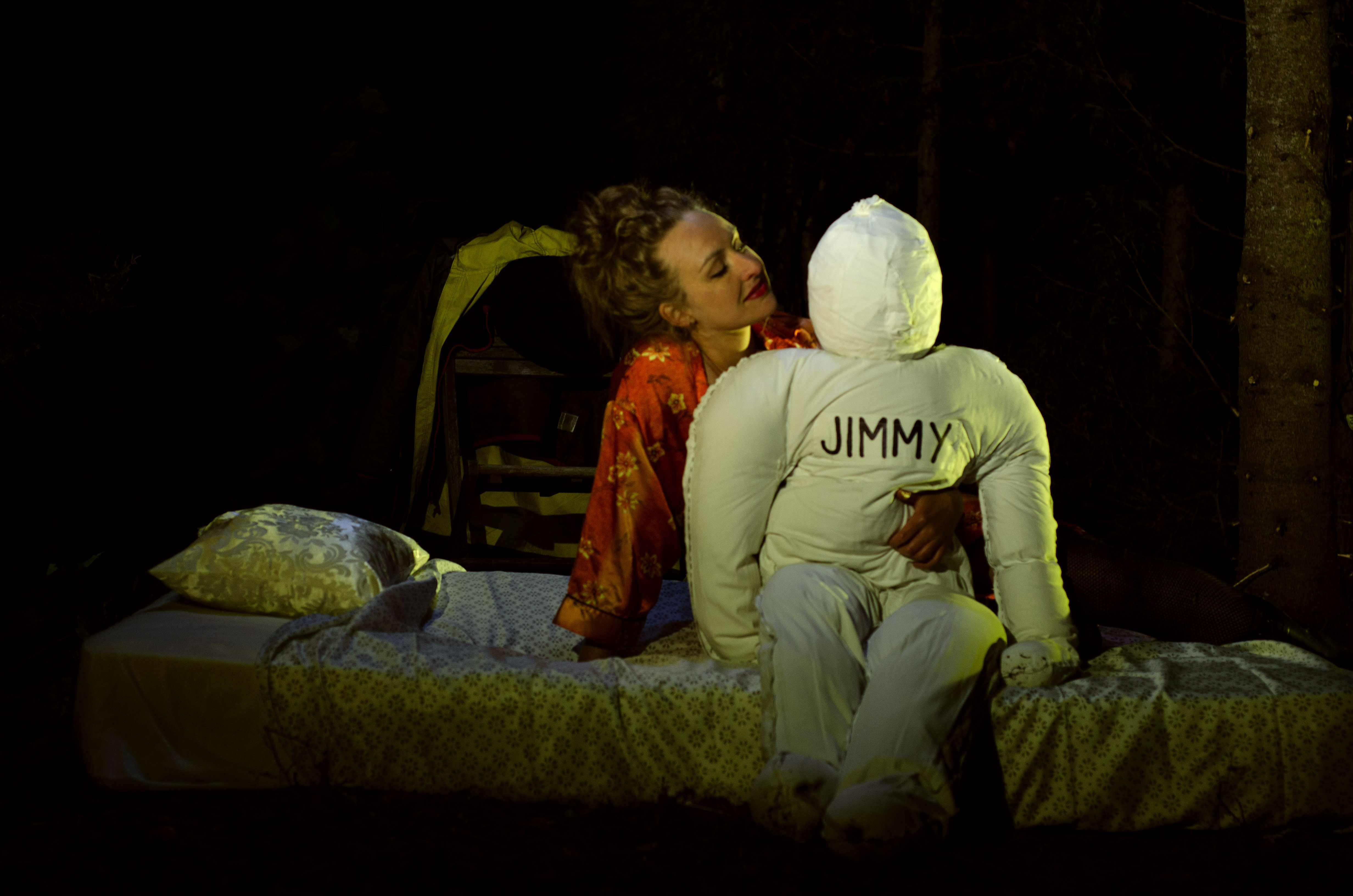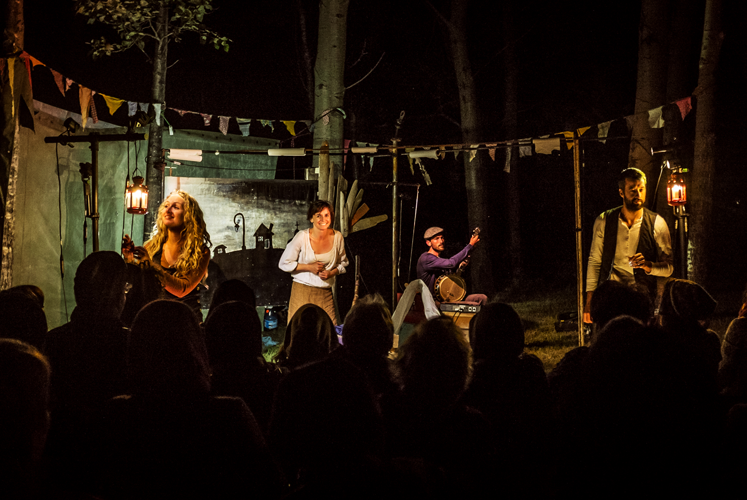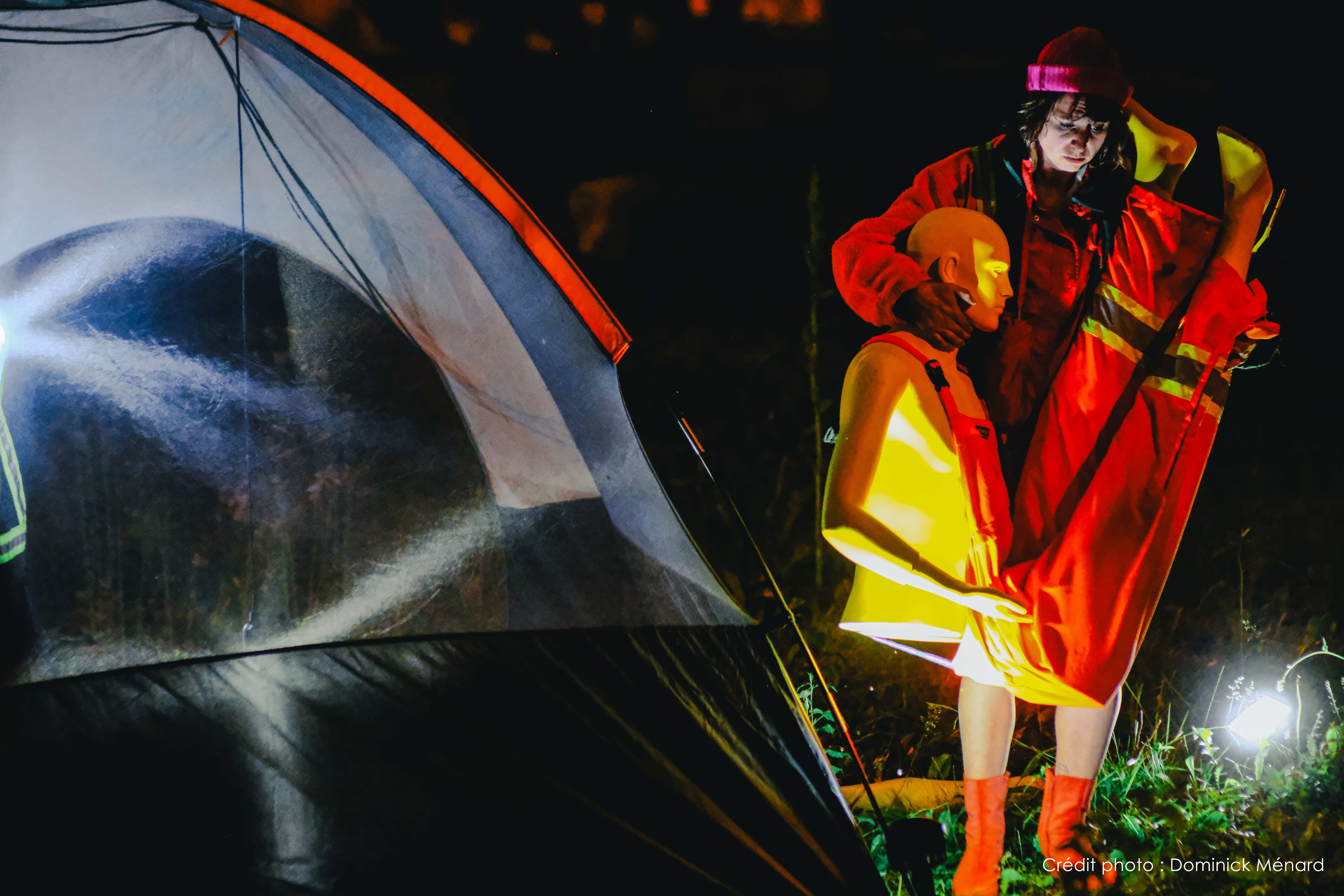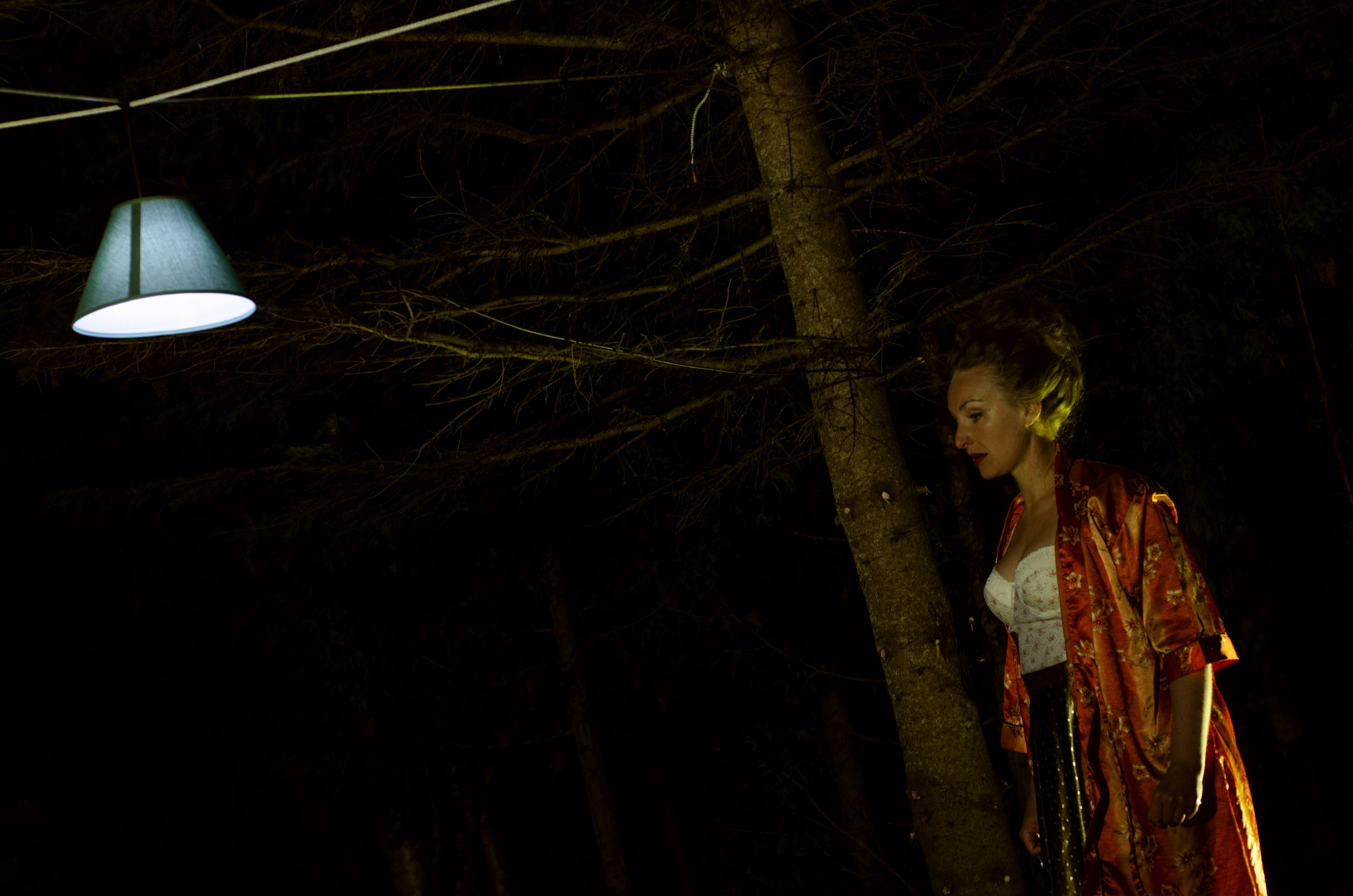 L’itinérance du spectacle reposait sur sa capacité à s’adapter aux différents terrains. Comme nous privilégions des lieux inhabituels, (auberge, parcs, bar, place publique) nous misions sur la simplicité de l’installation et l’autonomie en électricité. Quelques lanternes pour tamiser, notre boîte à musique de nuit et notre petite radio FM pour rythmer la soirée. Jouer partout, quand on veut. Dehors s’il fait beau, à l’intérieur si y faut. En deux temps, trois mouvements, l’espace se transformait, le texte s’adaptait, empruntait des éléments au réel, s’inspirait des alentours. C’est un spectacle en trompe-l’œil, pour voir le théâtre autrement.