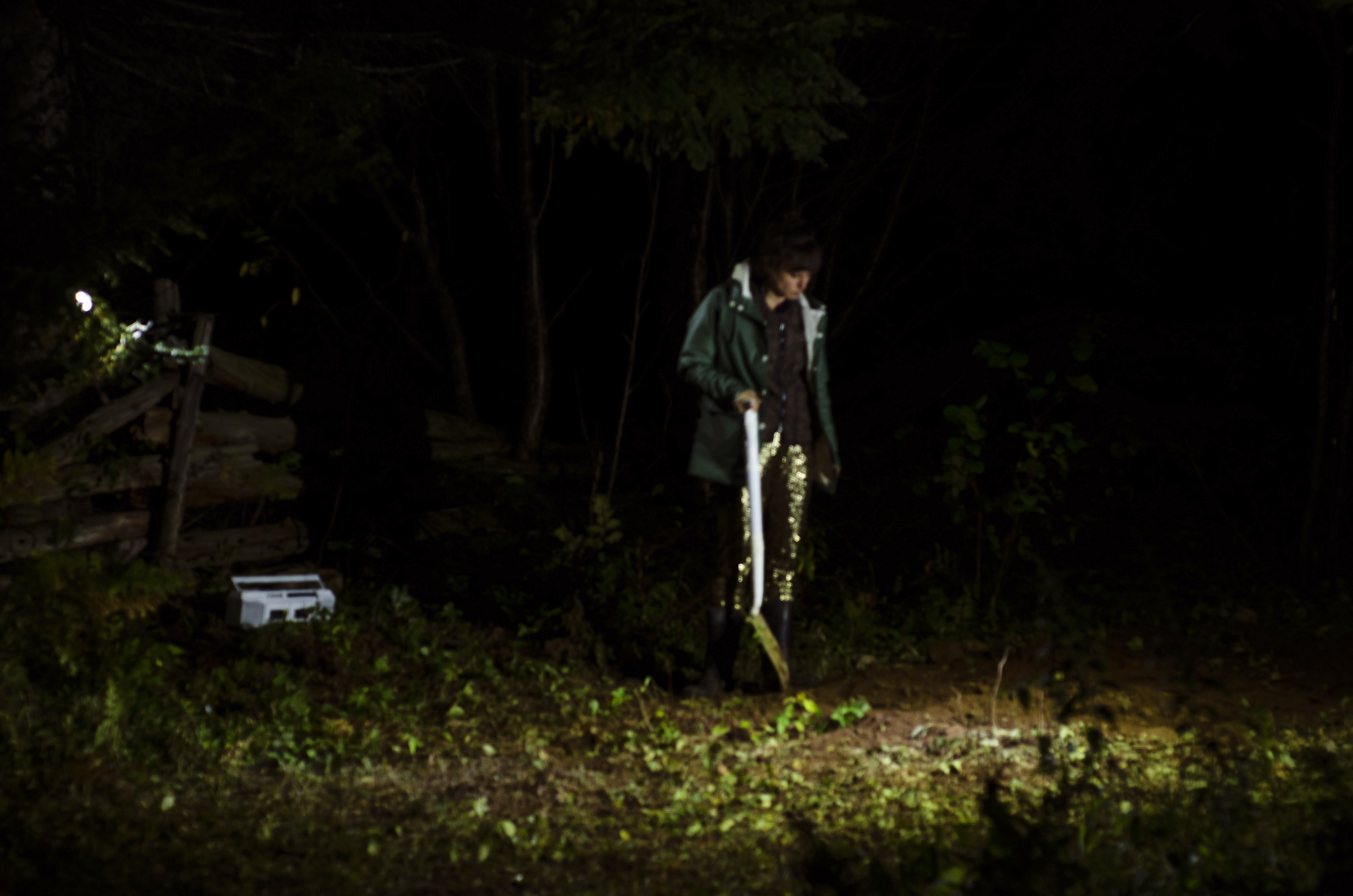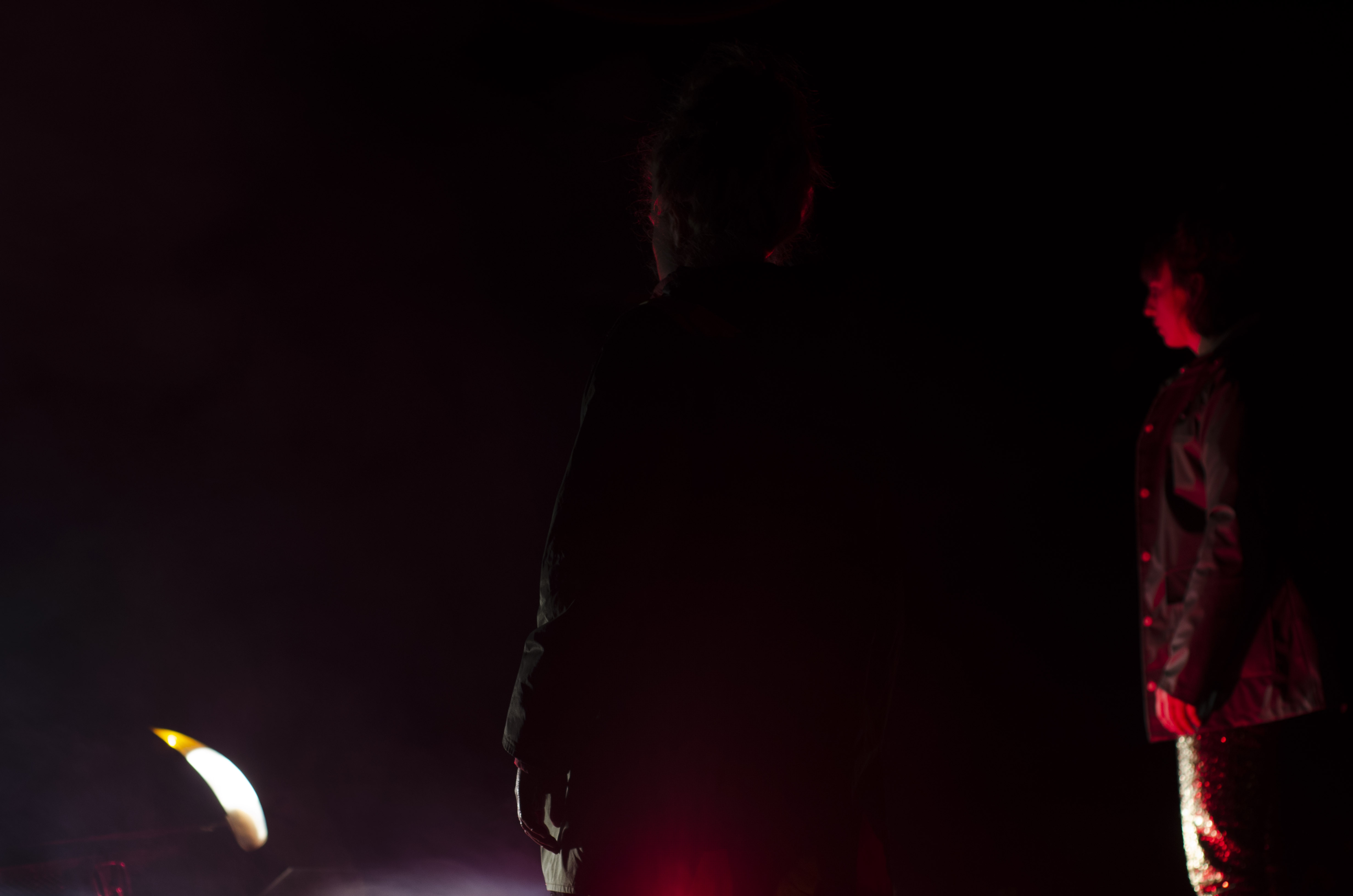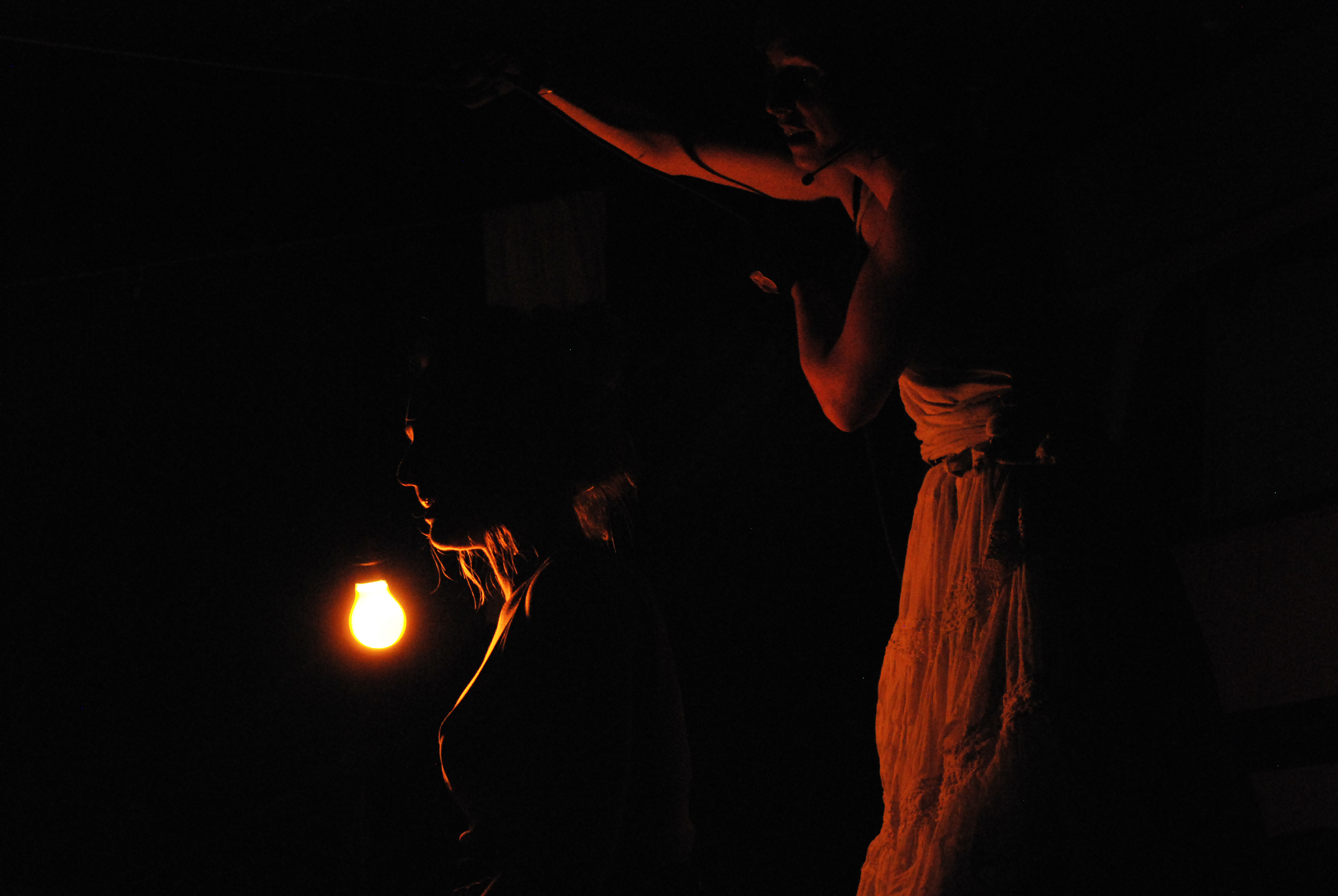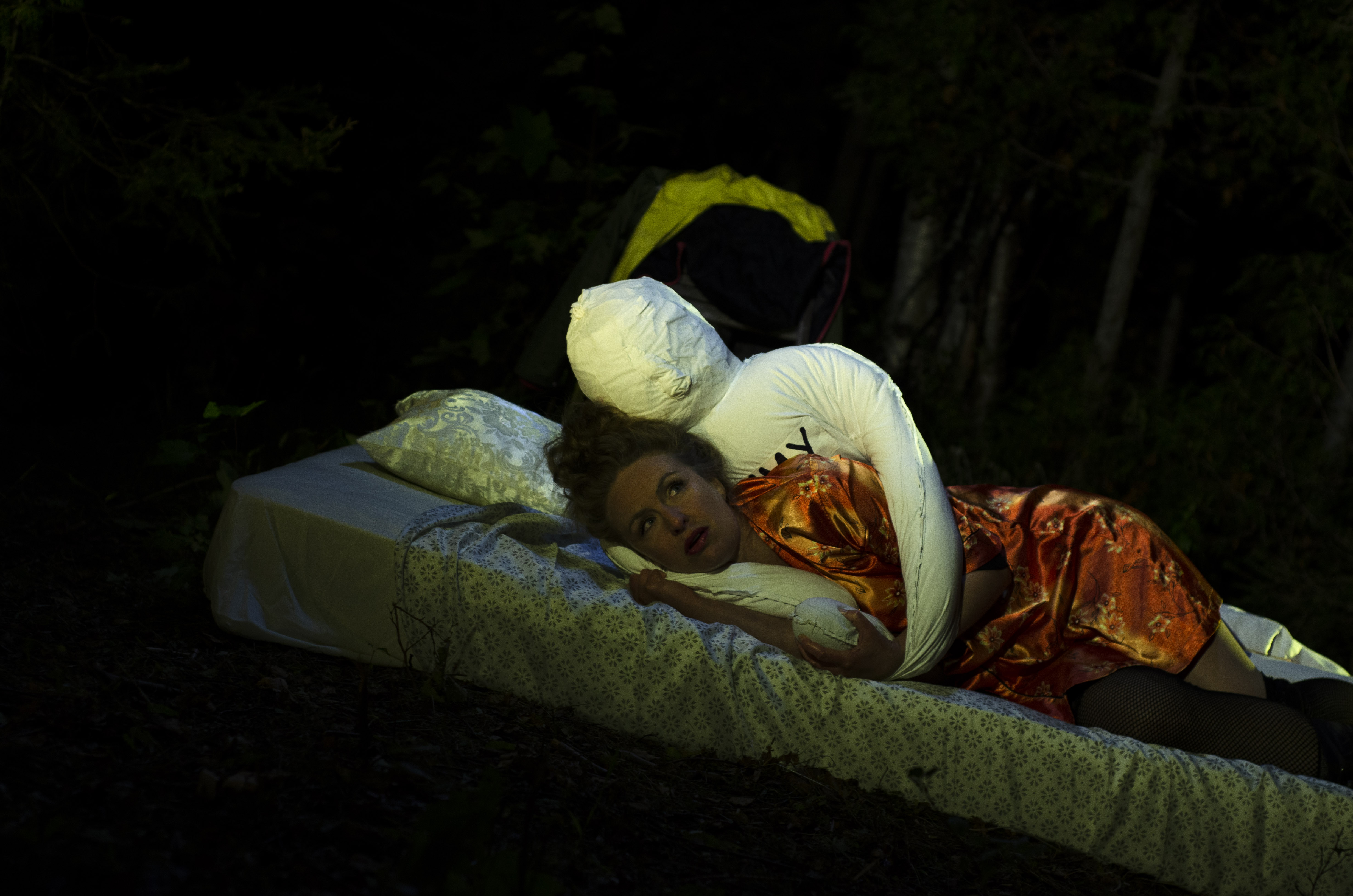 L’itinérance du spectacle reposait sur sa capacité à s’adapter aux différents terrains. Comme nous privilégions des lieux inhabituels, (auberge, parcs, bar, place publique) nous misions sur la simplicité de l’installation et l’autonomie en électricité. Quelques lanternes pour tamiser, notre boîte à musique de nuit et notre petite radio FM pour rythmer la soirée. Jouer partout, quand on veut. Dehors s’il fait beau, à l’intérieur si y faut. En deux temps, trois mouvements, l’espace se transformait, le texte s’adaptait, empruntait des éléments au réel, s’inspirait des alentours. C’est un spectacle en trompe-l’œil, pour voir le théâtre autrement.