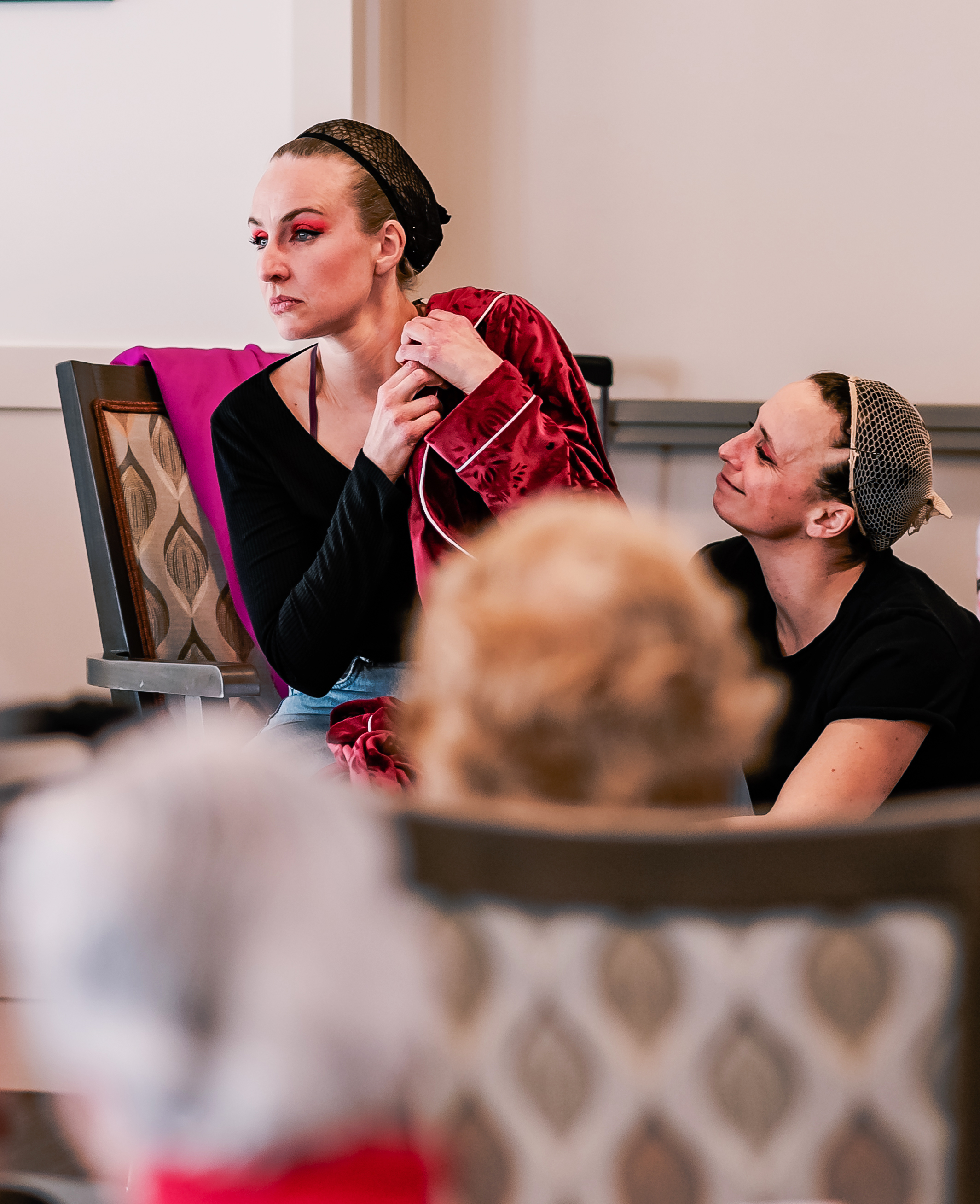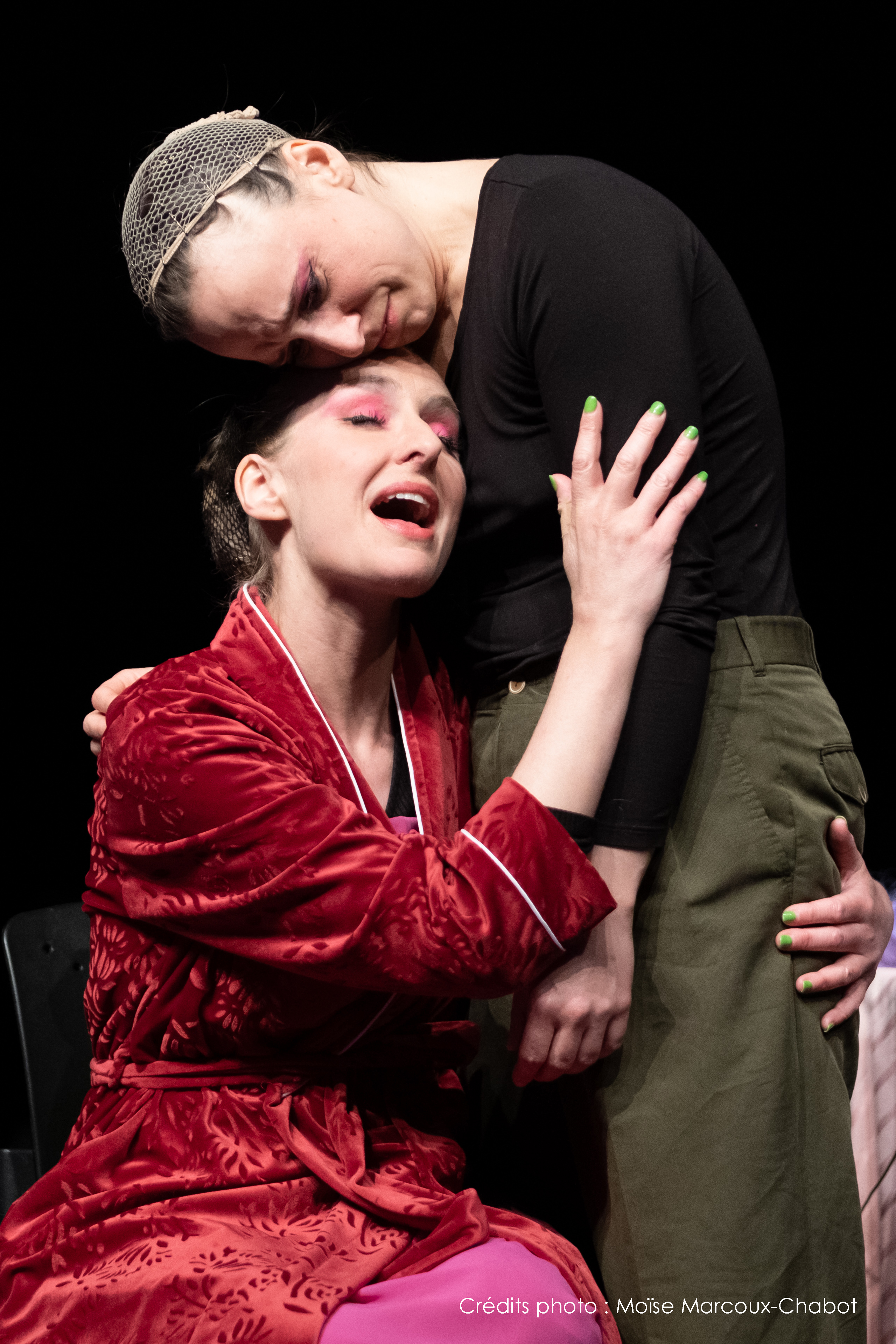 Comme sur la photo, c’est un spectacle musical, sensible et jubilatoire qui fait coexister deux femmes au cœur d’un huis-clos poignant et excentrique. Interprétée en duo, cette création questionne l’identité, de sa découverte à sa perte. L’une apprend qui elle est au contact de celle qui oublie. Thérèse, 82 ans, oppose la finitude de son existence à l’invincible jeunesse de sa petite-fille, Jolène, 18 ans. Au fil des tableaux, les mots se raréfient autant que les corps se fragilisent. Le nom des choses n’a plus d’importance et ceux qui échappent à Thérèse, Jolène les rebâtit à grands coups de mélodies. Elles revisitent les classiques des grandes dames de la musique des années 60. À travers la musique, elles éveillent les souvenirs de l’une, bâtissent l’avenir de l’autre. Avec leurs perruques et leurs paillettes, elles célèbrent la trame sonore de leur vie passée et à venir. Au cœur de cette rencontre humoristique et tendre, elles affrontent la mort qui vient lentement et l’amour qui rend toujours plus forte.
